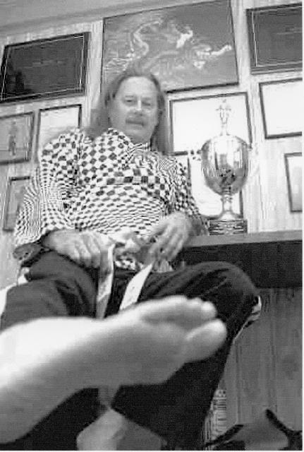 Munk sits with a trophy he received for being admitted to the Universal Martial Arts Hall of Fame in July 2003. Although he no longer competes because of heart surgery in the mid-'90s, Munk says he still finds the art rewarding and plans to continue it for his health and the discipline benefits it offers.